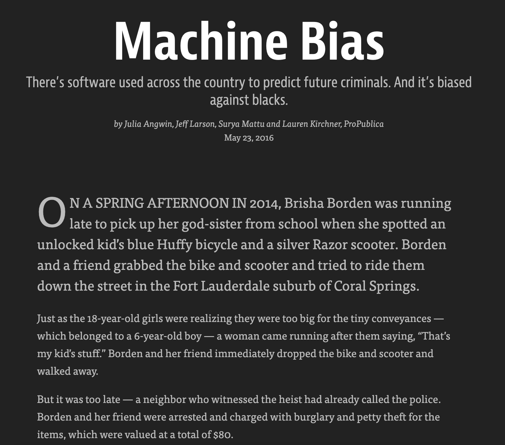 2016 ProPublica article on algorithm used for rating a defendant’s risk of future crime: